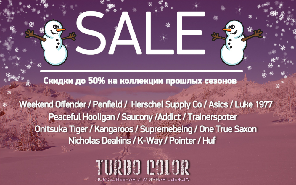 Здравствуйте друзья, мы рады Вам сообщить, что с сегодняшнего дня в магазине Turbocolor.ru стартует большая, новогодняя распродажа. Цены снижены до 50% практически все товары прошлых коллекций. Не упустите возможность порадовать себя и своих близких хорошим подарком по отличной цене. В акции участвуют практически все марки представленные в нашем магазине.