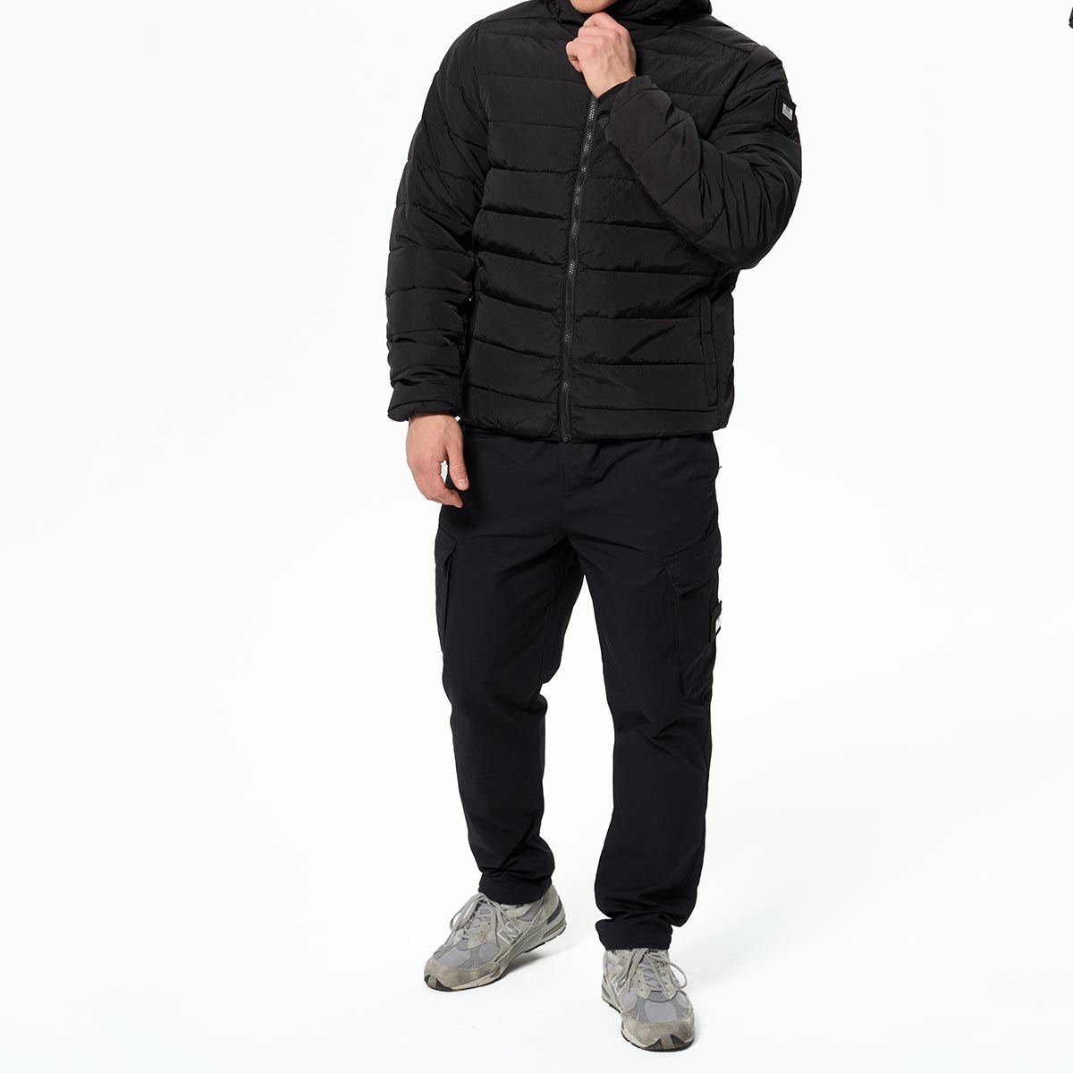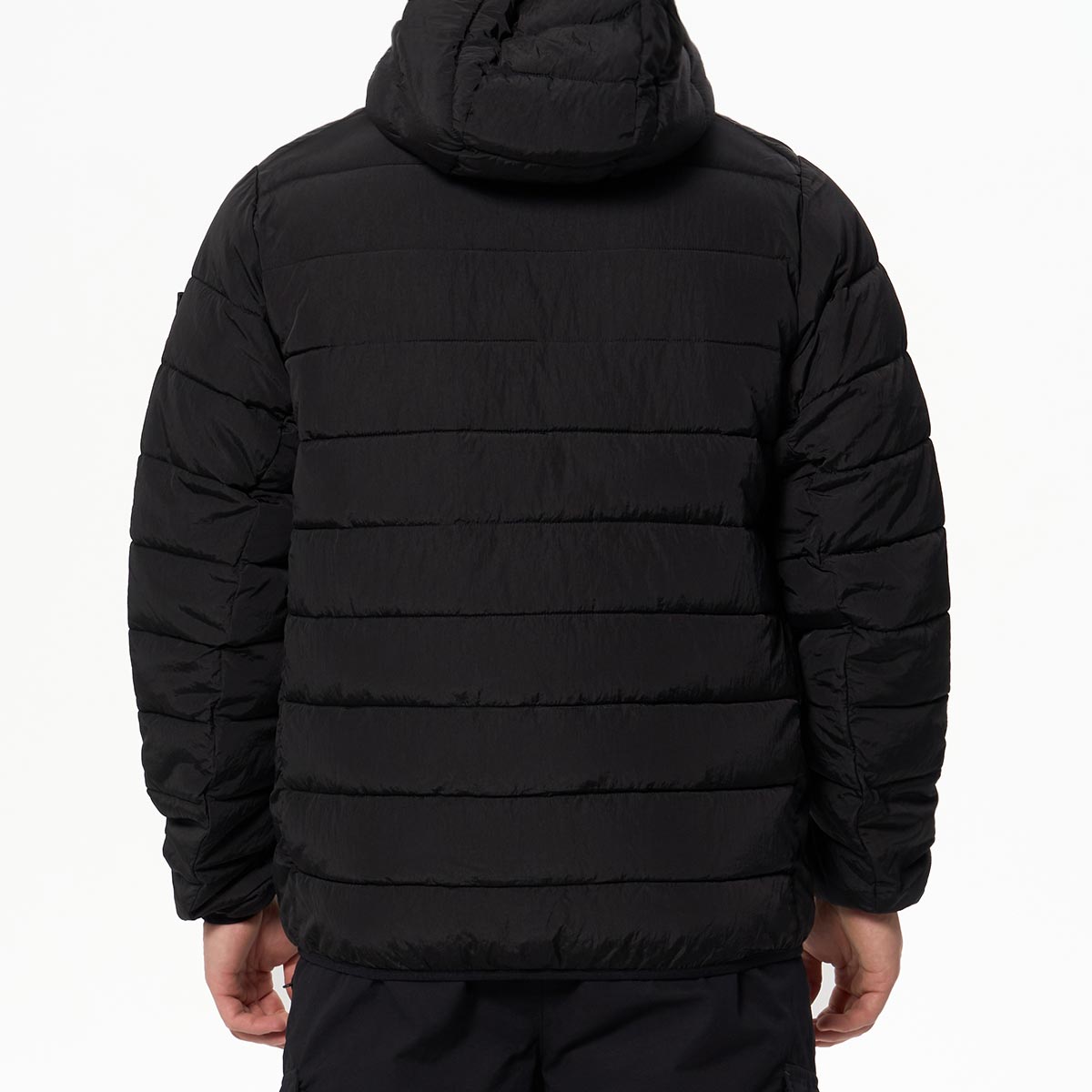 - Высокий ворот с капюшоном, стягивается резинками с брендированными фиксаторами