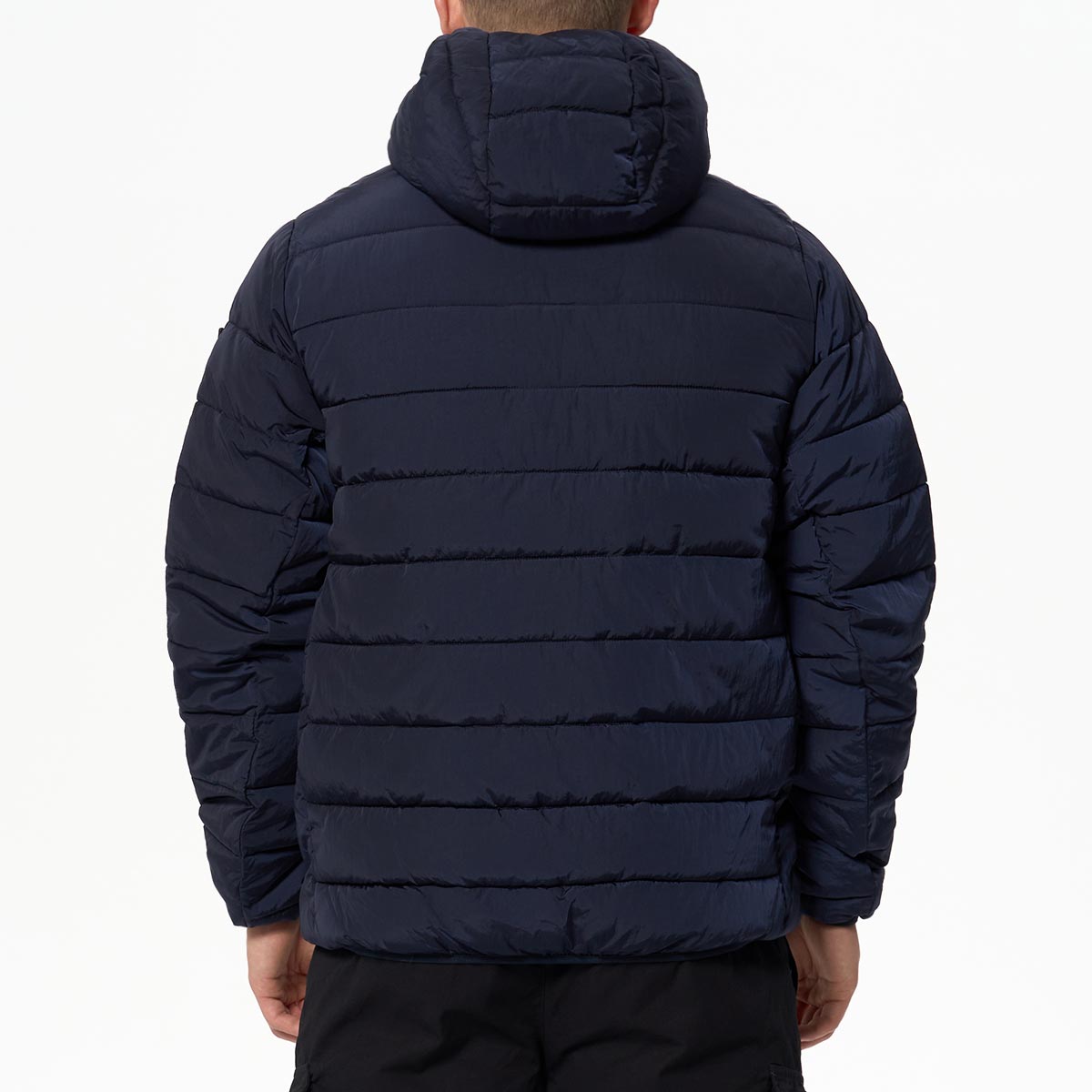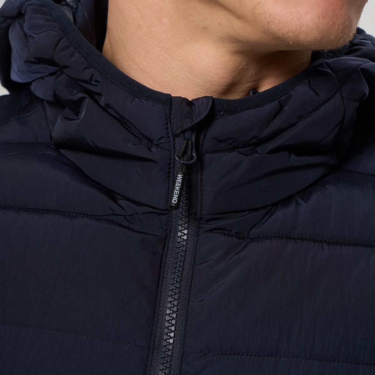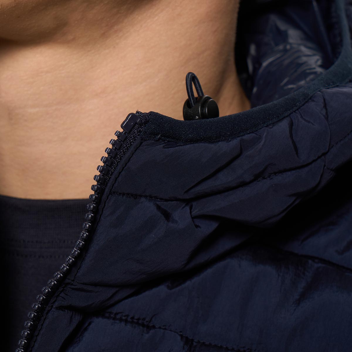 - Высокий ворот с капюшоном, стягивается резинками с брендированными фиксаторами